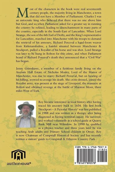 Most of the characters in the book were real seventeenth century people, the majority living in Manchester, a town that did not have a Member of Parliament. Charles I was an autocratic king who believed that there was no one above him but God, and so when Parliament asked for a greater say in running the country he refused, leading to disenchantment in many parts of the country, especially in the South-East of Lancashire. When Lord Strange, the son of the 6th Earl of Derby, and the King's representative for Lancashire, marched into Manchester with his troops to demand the retrieval of his armoury, Richard Perceval a hand-loom weaver from Kirkmanshulme, a hamlet situated between Manchester & Stockport, pulled a Royalist of his horse and was shot. Lord Strange was later to be hung in Bolton for this crime, and when Parliament heard of Richard Perceval's death they announced that a 'Civil War' has begun. Jenny Grimshawe, a member of a fictitious family living on the Ancoats Hall Estate of Nicholas Mosley, Lord of the Manor of Manchester, was due to marry Richard Perceval, but on hearing of his killing, avowed to avenge his death. She cross-dressed, joined the Royalist army, was present at the siege of Liverpool, the massacre at Bolton and obtained revenge at the battle of Marston Moor, three miles West of York.