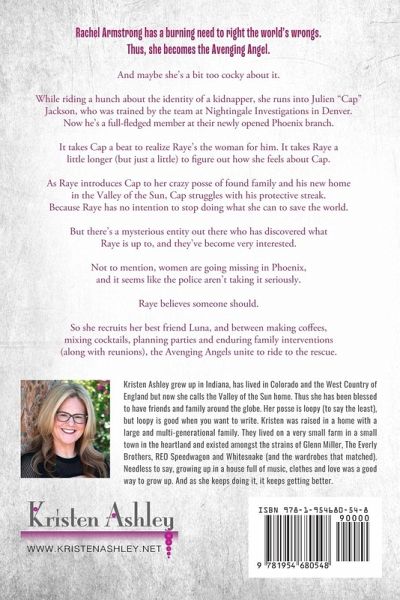 Rachel Armstrong has a burning need to right the world's wrongs. Thus, she becomes the Avenging Angel. And maybe she's a bit too cocky about it. While riding a hunch about the identity of a kidnapper, she runs into Julien "Cap" Jackson, who was trained by the team at Nightingale Investigations in Denver. Now he's a full-fledged member at their newly opened Phoenix branch. It takes Cap a beat to realize Raye's the woman for him. It takes Raye a little longer (but just a little) to figure out how she feels about Cap. As Raye introduces Cap to her crazy posse of found family and his new home in the Valley of the Sun, Cap struggles with his protective streak. Because Raye has no intention to stop doing what she can to save the world. But there's a mysterious entity out there who has discovered what Raye is up to, and they've become very interested. Not to mention, women are going missing in Phoenix, and it seems like the police aren't taking it seriously. Raye believes someone should. So she recruits her best friend Luna, and between making coffees, mixing cocktails, planning parties and enduring family interventions (along with reunions), the Avenging Angels unite to ride to the rescue.