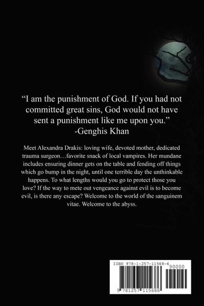 "I am the punishment of God. If you had not committed great sins, God would not have sent a punishment like me upon you." -Genghis Khan Meet Alexandra Drakis: loving wife, devoted mother, dedicated trauma surgeon...favorite snack of local vampires. Her mundane includes ensuring dinner gets on the table and fending off things which go bump in the night, until one terrible day the unthinkable happens. To what lengths would you go to protect those you love? If the only way to mete out vengeance against evil is to become evil, is there any escape? Welcome to the world of the sanguinem vitae. Welcome to the abyss.