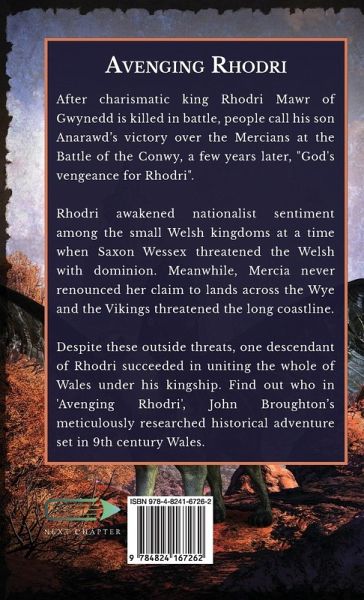 After charismatic king Rhodri Mawr of Gwynedd is killed in battle, people call his son Anarawd's victory over the Mercians at the Battle of the Conwy, a few years later, "God's vengeance for Rhodri". Rhodri awakened nationalist sentiment among the small Welsh kingdoms at a time when Saxon Wessex threatened the Welsh with dominion. Meanwhile, Mercia never renounced her claim to lands across the Wye and the Vikings threatened the long coastline. Despite these outside threats, one descendant of Rhodri succeeded in uniting the whole of Wales under his kingship. Find out who in 'Avenging Rhodri', John Broughton's meticulously researched historical adventure set in 9th century Wales.