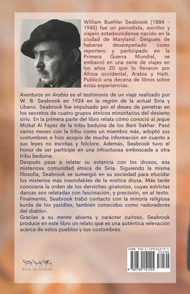 Aventuras en Arabia es el testimonio de un viaje realizado por W. B. Seabrook en 1924 en la región de la actual Siria y Líbano. Seabrook fue impulsado por el deseo de penetrar en los secretos de cuatro grupos étnicos minoritarios del desierto sirio. En la primera parte del libro relata cómo conoció al jeque Mizkal Al Fayez de la tribu beduina de los Beni Sakhar. Pasó varios meses con la tribu como un miembro más, adoptó sus costumbres e hizo acopio de mucha información en cuanto a sus leyes no escritas y folclore. Además, Seabrook tuvo la fortuna de ser partícipe en una infructuosa emboscada a otra tribu beduina. Después pasa a relatar su estancia con los drusos, esa misteriosa comunidad étnica de Siria. Siguiendo la misma filosofía, Seabrook se sumergió en su sociedad para elucidar los misterios más insondables de la mística drusa. Más tarde entraría en contacto con una orden de derviches giratorios, cuyas estrictas danzas son relatadas con precisión en el texto. Finalmente, Seabrook trabó contacto con la minoría religiosa kurda de los yazidíes, también conocidos como adoradores del diablo. De una mente abierta y carácter curioso, Seabrook produce en este libro un relato que es una auténtica relevación acerca de estos pueblos y sus costumbres.