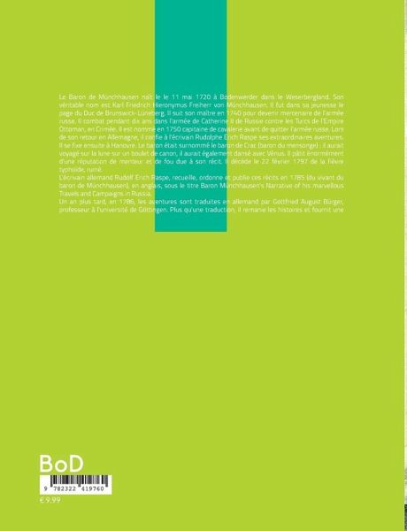 Le Baron de Münchhausen naît le le 11 mai 1720 à Bodenwerder dans le Weserbergland. Son véritable nom est Karl Friedrich Hieronymus Freiherr von Münchhausen. Il fut dans sa jeunesse le page du Duc de Brunswick-Lüneberg. Il suit son maître en 1740 pour devenir mercenaire de l'armée russe. Il combat pendant dix ans dans l'armée de Catherine II de Russie contre les Turcs de l'Empire Ottoman, en Crimée. Il est nommé en 1750 capitaine de cavalerie avant de quitter l'armée russe. Lors de son retour en Allemagne, il confie à l'écrivain Rudolphe Erich Raspe ses extraordinaires aventures. Il se fixe…mehr