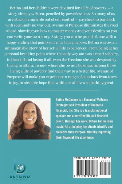 Betina and her children were destined for a life of poverty - astory already written, penciled by powerlessness. So many of usare stuck, living a life out of our control - paycheck to paycheckwith seemingly no way out. Avenue of Purpose illuminates the roadahead, showing you how to master money and your destiny so youcan write your own story. A story you can be proud of, one with ahappy ending that points out your true purpose. Betina weaves anunimaginable story of her actual life experiences. From being at herpersonal breaking point where the only way out was armed robbery,to then the jail and losing it all, even the freedom she was desperatelytrying to attain. To now where she owns a business helping thoseliving a life of poverty find their way to a better life. Avenue ofPurpose will make you experience a range of emotions from tearsto joy, to absolute hope that within us all lives something great.______________________________________ Betina Mccadney is a financial wellness strategist and president of umbrella financial, Inc. She is a speaker and financial coach. Through her work, Betina has become masterful at identity and teaching her clients to monetize their purpose thereby improving their financial life experience.