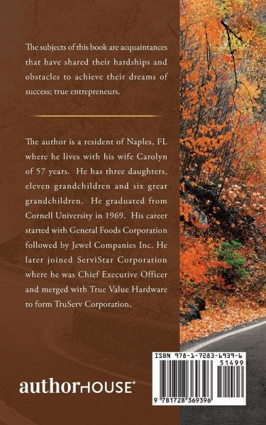 The author is a resident of Naples, FL where he lives with his wife Carolyn of 57 years. He has three daughters, eleven grandchildren and six great grandchildren. He graduated from Cornell University in 1969. His career started with General Foods Corporation followed by Jewel Companies Inc. He later joined ServiStar Corporation where he was Chief Executive Officer and merged with True Value Hardware to form TruServ Corporation. The subjects of this book are acquaintances that have shared their hardships and obstacles to achieve their dreams of success; true entrepreneurs. Hope you enjoy these stories of hard work, dedication and triumph.