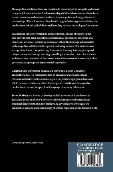 The cognitive abilities of birds are remarkable: hummingbirds integrate spatial and temporal information about food sources, day-old chicks have a sense of numbers, parrots can make and use tools, and ravens have sophisticated insights in social relationships. This volume describes the full range of avian cognitive abilities, the mechanisms behind such abilities and how they relate to the ecology of the species. Synthesising the latest research in avian cognition, a range of experts in the field provide first-hand insights into experimental procedures, outcomes and theoretical advances, including a discussion of how the findings in birds relate to the cognitive abilities of other species, including humans. The authors cover a range of topics such as spatial cognition, social learning, tool use, perceptual categorization and concept learning, providing the broader context for students and researchers interested in the current state of avian cognition research, its key questions and appropriate experimental approaches.
