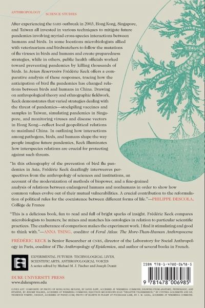 After experiencing the SARS outbreak in 2003, Hong Kong, Singapore, and Taiwan all invested in various techniques to mitigate future pandemics involving myriad cross-species interactions between humans and birds. In some locations microbiologists allied with veterinarians and birdwatchers to follow the mutations of flu viruses in birds and humans and create preparedness strategies, while in others, public health officials worked toward preventing pandemics by killing thousands of birds. In Avian Reservoirs Frédéric Keck offers a comparative analysis of these responses, tracing how the anticipation of bird flu pandemics has changed relations between birds and humans in China. Drawing on anthropological theory and ethnographic fieldwork, Keck demonstrates that varied strategies dealing with the threat of pandemics-stockpiling vaccines and samples in Taiwan, simulating pandemics in Singapore, and monitoring viruses and disease vectors in Hong Kong-reflect local geopolitical relations to mainland China. In outlining how interactions among pathogens, birds, and humans shape the way people imagine future pandemics, Keck illuminates how interspecies relations are crucial for protecting against such threats.