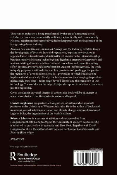 The aviation industry is being transformed by the use of unmanned aerial vehicles, or drones - commercially, militarily, scientifically and recreationally. National regulations have generally failed to keep pace with the expansion of the fast-growing drone industry. Aviation Law and Drones: Unmanned Aircraft and the Future of Aviation traces the development of aviation laws and regulations, explains how aviation is regulated at an international and national level, considers the interrelationship between rapidly advancing technology and legislative attempts to keep pace, and reviews existing domestic and international drone laws and issues (including safety, security, privacy and airspace issues). Against this background, the book uniquely proposes a rationale for, and key provisions of, guiding principles for the regulation of drones internationally - provisions of which could also be implemented domestically. Finally, the book examines the changing shape of our increasingly busy skies - technology beyond drones and the regulation of that technology. The world is on the edge of major disruption in aviation - drones are just the beginning. Given the almost universal interest in drones, this book will be of interest to readers worldwide, from the academic sector and beyond.
