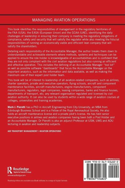 This book identifies the responsibilities of management in the regulatory territories of the FAA (USA), the EASA (European Union) and the GCAA (UAE), identifying the daily challenges of leadership in ensuring their company is meeting the regulatory obligations of compliance, safety and security that will satisfy the regulator while also meeting the fiducial responsibilities of running an economically viable and efficient lean company that will satisfy the shareholders.