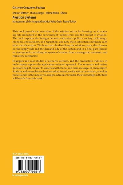 The Future of Mobility: Trends That Will Shape the Mobility and Aviation Industry in the Future.- Fundamentals and Structure of Aviation Systems.- The Environment of Aviation.- From the Aviation Value Chain to the Aviation System.- Airline Strategy - From Network Management to Business Models.- From Airline Network Development to Airline Operations.- Managing Airports.- Demand and Marketing in Aviation.- Passenger Behaviouristics.- Authorities and Regulations in Aviation.- The Holy Grail of Aviation: Risk, Safety and Security.- Human Factors in Aviation.- Risk Management in Aviation.- Aviation Governance.- Long-term Planning of Organizations in Industries With High Uncertainty Environments. New Frontiers in Aviation: Supersonic, Space Travel & Drones.