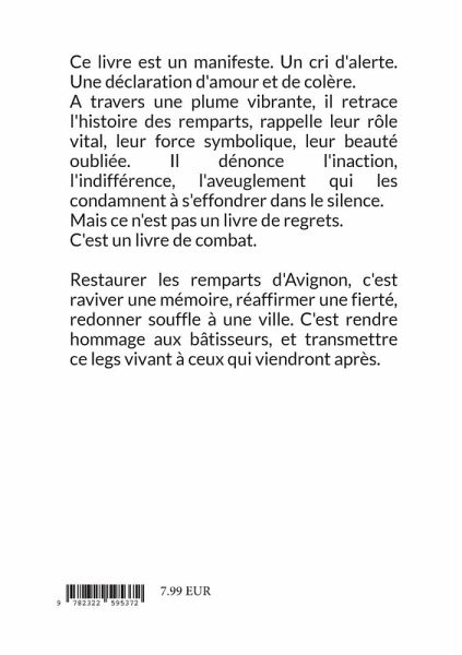 Tout le monde connaît le Palais des Papes, le Pont Saint Bénezet, beaucoup fredonnent encore "sur le Pont d'Avignon". Mais qui parle des remparts d'Avignon ? Qui se soucie de ces murailles du XIVe siècle, classées au patrimoine mondial de l'UNESCO, inscrites plusieurs fois aux Monuments historiques, et pourtant laissées à l'abandon ? Ce livre est un manifeste. Un cri d'alerte. Une déclaration d'amour et de colère. A travers une plume vibrante, il retrace l'histoire des remparts, rappelle leur rôle vital, leur force symbolique, leur beauté oubliée. Il dénonce l'inaction, l'indifférence, l'aveuglement qui les condamnent à s'effondrer dans le silence. Mais ce n'est pas un livre de regrets. C'est un livre de combat. Restaurer les remparts d'Avignon, c'est raviver une mémoire, réaffirmer une fierté, redonner souffle à une ville. C'est rendre hommage aux bâtisseurs, et transmettre ce legs vivant à ceux qui viendront après.