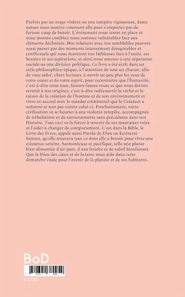 Parfois par un orage violent ou une tempête vigoureuse, dame nature nous montre comment elle peut s'emporter par de furieux coup de butoir. L'événement nous remet en place et nous montre combien nous sommes vulnérables face aux éléments déchainés. Nos relations avec nos semblables peuvent aussi passer par des moments intensément désagréables et conflictuels qui nous montrent nos faiblesses face à l'autre, ses besoins et ses aspirations, et ainsi nous amener à une séparation sociale ou une division politique. Ce livre a été écrit dans un style philosophico-épique, à l'attention de tout un chacun, afin de vous aider, chers lecteurs, à ouvrir un peu plus les yeux de votre coeur et de votre esprit, pour reconnaitre que l'humanité, c'est-à-dire nous tous, faisons fausse route et que nous devons revenir à nos origines, c'est-à-dire redécouvrir la vérité et la raison de la création de l'homme et de son environnement et vivre en accord avec le mandat créationnel que le Créateur a ordonné et non pas contre celui-ci. Prochainement, notre civilisation va se heurter à une violente tempête, accompagnée de tribulations et de renversements sans précédents dans son Histoire. Tout ceci va la forcer à revenir de ses mauvaises voies et l'aider à changer de comportement. C'est dans la Bible, le Livre des livres, appelé aussi Parole de Dieu ou Ecritures Saintes, qu'elle trouvera tout ce dont elle a besoin pour vivre une existence sereine, harmonieuse et pacifique, telle une plante bien alimentée d'air pure, d'eau fraiche et de soleil bienfaisant. Que le Dieu des cieux et de la terre nous aide dans cette démarche vitale pour l'avenir de la planète et de ses habitants.