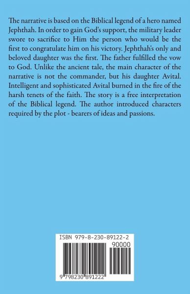 The narrative is based on the Biblical legend of a hero named Jephthah. In order to gain God's support, the military leader swore to sacrifice to Him the person who would be the first to congratulate him on his victory. Jephthah's only and beloved daughter was the first. The father fulfilled the vow to God. Unlike the ancient tale, the main character of the narrative is not the commander, but his daughter Avital. Intelligent and sophisticated Avital burned in the fire of the harsh tenets of the faith. The story is a free interpretation of the Biblical legend. The author introduced characters required by the plot - bearers of ideas and passions.