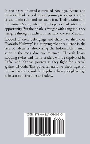 In the heart of cartel-controlled Ancingo, Rafael and Karina embark on a desperate journey to escape the grip of economic ruin and constant fear. Their destination: the United States, where they hope to find safety and opportunity. But their path is fraught with danger, as they navigate through treacherous territory towards Mexicali. Robbed of their belongings and shaken to their core "Avocado Highway" is a gripping tale of resilience in the face of adversity, showcasing the indomitable human spirit in the most dire circumstances. Through heart-stopping twists and turns, readers will be captivated by Rafael and Karina's journey as they fight for survival against all odds. This powerful narrative sheds light on the harsh realities, and the lengths ordinary people will go to in search of freedom and safety.