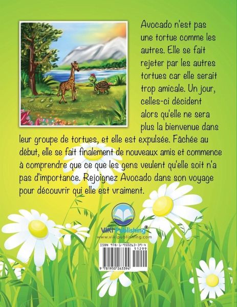 Avocado n'est pas une tortue comme les autres. Elle se fait rejeter par les autres tortues car elle serait trop amicale. Un jour, celles-ci décident alors qu'elle ne sera plus la bienvenue dans leur groupe de tortues, et elle est expulsée. Fâchée au début, elle se fait finalement de nouveaux amis et commence à comprendre que ce que les gens veulent qu'elle soit n'a pas d'importance. Rejoignez Avocado dans son voyage pour découvrir qui elle est vraiment. ==== Avocado is not a normal turtle. She is rejected by the other turtles for being too friendly. One day, they decide she should no longer be welcomed in their turtle group, and she is sent away. Upset at first, she eventually meets new friends and starts to understand it doesn't matter what people want her to be. Join Avocado on her journey to find her true self.