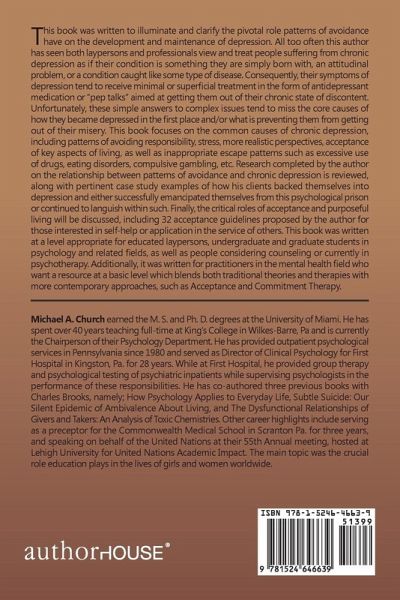 This book was written to illuminate and clarify the pivotal role patterns of avoidance have on the development and maintenance of depression. All too often this author has seen both laypersons and professionals view and treat people suffering from chronic depression as if their condition is something they are simply born with, an attitudinal problem, or a condition caught like some type of disease. Consequently, their symptoms of depression tend to receive minimal or superficial treatment in the form of antidepressant medication or "pep talks" aimed at getting them out of their chronic state of discontent. Unfortunately, these simple answers to complex issues tend to miss the core causes of how they became depressed in the first place and/or what is preventing them from getting out of their misery. This book focuses on the common causes of chronic depression, including patterns of avoiding responsibility, stress, more realistic perspectives, acceptance of key aspects of living, as well as inappropriate escape patterns such as excessive use of drugs, eating disorders, compulsive gambling, etc. Research completed by the author on the relationship between patterns of avoidance and chronic depression is reviewed, along with pertinent case study examples of how his clients backed themselves into depression and either successfully emancipated themselves from this psychological prison or continued to languish within such. Finally, the critical roles of acceptance and purposeful living will be discussed, including 32 acceptance guidelines proposed by the author for those interested in self-help or application in the service of others. This book was written at a level appropriate for educated laypersons, undergraduate and graduate students in psychology and related fields, as well as people considering counseling or currently in psychotherapy. Additionally, it was written for practitioners in the mental health field who want a resource at a basic level which blends both traditional theories and therapies with more contemporary approaches, such as Acceptance and Commitment Therapy.