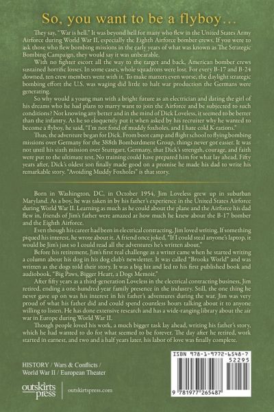 The future looked bright for many young men before the United States entered World War II on December 7th, 1941. Richard (Dick) Loveless from Washington, DC, was no exception. He had joined an apprenticeship program to follow in his dads' footsteps to become an electrician. The prospects were good for Dick as he seemed to have what it took to succeed. Handsome and athletic, he had charmed his way into the heart of Mary Lu Farrell, a beautiful and equally talented girl from Northwest Washington, DC. Though neither really discussed it, marriage was undoubtedly on the horizon. Unfortunately, a war got in the way. He was forced to decide between being drafted into the Army or enlisting so he could choose what branch of the service he would serve. Dick enlisted. Regrettably, enlisting didn't matter; he wound up in the coastal artillery. As luck would have it, an opportunity to join the Air Corps presented itself, and Dick took it. Thus, the adventure began for Dick. From boot camp and flight school to flying bombing missions over Germany for the 388th Bombardment Group, things never got easier. But it was only in his sixth mission over Stuttgart, Germany, that his strength, courage, and faith were put to the ultimate test. No training could prepare him for what lay ahead. Eighty years later, Dicks oldest son finally made good on a promise he made him. He vowed never to let his father's remarkable story go untold, so "Avoiding Muddy Foxholes" is his story.
