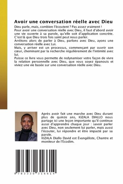 Dieu parle, mais, combien l'écoutent ? Pas assez vraiment !Pour avoir une conversation réelle avec Dieu, il faut d'abord avoir une vie ouverte à sa parole, qu'elle soit d'application concrète. C'est là que Dieu trois fois saint peut nous parler.Arrêtons alors de parler à Dieu, parlons avec Dieu, ayons une conversation réelle avec Lui.Mais, y arriver est un processus, commençant par ouvrir son coeur, cheminant par la recherche régulièrement de l'intimité avec lui.Puisse ce livre vous permette de redynamiser votre façon de vivre la relation personnelle avec Dieu, que vous soyez épanouis et viviez une vie basée sur une conversation réelle avec Dieu.