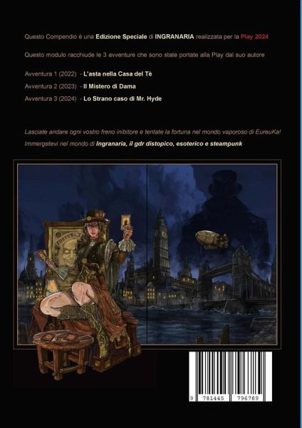Questo libro è una special edition delle 3 prime avventure di Ingranaria uscita per Play 2024!! Contiene: Avventura 1 (2022): L'asta nella Casa del Tè Avventura 2 (2023): Il Ritratto di Dama Avventura 3 (2024): Lo Strano Caso di Mr. Hyde Si tratta di un modulo che racchiude le 3 avventure che sono state portate alla Play in questi anni di lavoro con il gioco di ruolo di INGRANARIA. Le avventure sono state sistemate e aggiornate al nuovo sistema di gioco MorfoX System e contengono ulteriori pregi: ¿ Ogni avventura è stata sistemata e migliorata grazie proprio alle esperienze di gioco fatte con i numerosi giocatori che hanno partecipato alle varie sessioni di Play. ¿ Sono presenti dei riquadri che fanno riferimento alle regole del QSG 2024 e aiutano il Maestro degli Ingranaggi a condurre la sessione. ¿ Le descrizioni sono state aggiornate alla nuova cronostoria di EureuKa, che prevede un mondo ancora più steampunk e la possibilità di giocare con personaggi storici del tempo. ¿ Le schede dei personaggi sono state aggiornate e viene introdotto il MorfoX Customize System, il sistema di gioco per la creazione di armi, innesti e armature personalizzate. Lasciate andare ogni vostro freno e immergetevi nel mondo di Ingranaria, il gdr distopico, esoterico e steampunk.