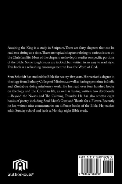 Awaiting the King is a study in Scripture. There are forty chapters that can be read one sitting at a time. There are topical chapters relating to various issues on the Christian life. Most of the chapters are in-depth studies on specific portions of the Bible. Some tough issues are tackled, but written in an easy to read style. This book is a refreshing encouragement to love the Word of God.