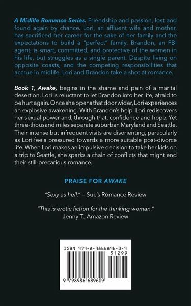 A Midlife Romance Series. Friendship and passion, lost and found again by chance. Lori, an affluent wife and mother, has sacrificed her career for the sake of her family and the expectations to build a "perfect" family. Brandon, an FBI agent, is smart, committed, and protective of the women in his life, but struggles as a single parent. Despite living on opposite coasts, and the competing responsibilities that accrue in midlife, Lori and Brandon take a shot at romance. Book 1, Awake, begins in the shame and pain of a marital desertion. Lori is reluctant to let Brandon into her life, afraid to be hurt again. Once she opens that door wider, Lori experiences an explosive awakening. With Brandon's help, Lori rediscovers her sexual power and, through that, confidence and hope. Yet three-thousand miles separate suburban Maryland and Seattle. Their intense but infrequent visits are disorienting, particularly as Lori feels pressured towards a more suitable post-divorce life. When Lori makes an impulsive decision to take her kids on a trip to Seattle, she sparks a chain of conflicts that might end their still-precarious romance.