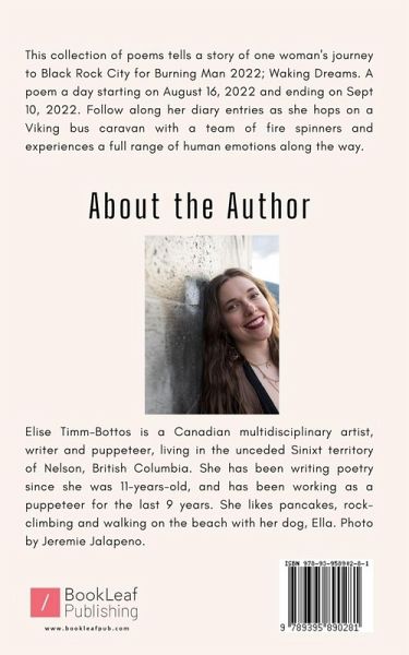 This collection of poems tells a story of one woman's journey to Black Rock City for Burning Man 2022; Waking Dreams. A poem a day starting on August 16, 2022 and ending on Sept 10, 2022. Follow along her diary entries as she hops on a Viking bus caravan with a team of fire spinners and experiences a full range of human emotions along the way.