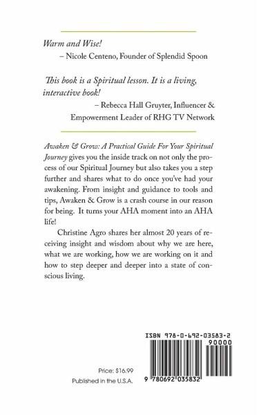 Awaken & Grow: A Practical Guide For Your Spiritual Journey gives you the inside track on not only the process of our Spiritual Journey but also takes you a step further and shares what to do once you’ve had your awakening. From insight and guidance to tools and tips, Awaken & Grow is a crash course in our reason for being. Christine Agro shares her almost 20 years of receiving insight and wisdom about why we are here, what we are working, how we are working on it and how to step deeper and deeper into a state of conscious living.Awaken & Grow: A Practical Guide For Your Spiritual Journey gives you the inside track on not only the process of our Spiritual Journey but also takes you a step further and shares what to do once you’ve had your awakening. From insight and guidance to tools and tips, Awaken & Grow is a crash course in our reason for being. It turns your AHA moment into an AHA life! Christine Agro shares her almost 20 years of receiving insight and wisdom about why we are here, what we are working, how we are working on it and how to step deeper and deeper into a state of conscious living. Awaken & Grow is broken into three parts: Awaken, Grow and Putting It All Together.In Awaken, Christine takes you through the phases of our awakening process, explains why and how we awaken and why we don’t come in awakened in the first place. In Grow, she explores the three stages that our growth takes us through – no matter what lesson you are trying to learn, you are going to move through these three stages and understanding this can help you move more quickly and more easily through the process. She also explores the three core life lessons we are all working on, lessons that are the root of any conflict you might experience. Understand this and you will be that much closer to learning those lessons and moving forward on your journey. In Putting It All Together, Christine dives into some of the tools to help you navigate your Spiritual growth and shares some of the ways that living an Awakened life can help you create the life you love. As Christine is experiential in nature and believes in doing over reading, so at the end of the book, she’s included a link that takes you to the Awaken & Grow Bonus Package which includes mini video courses designed to help you move the information in this book from your mind to your body.