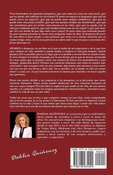 Vives haciéndote las siguientes preguntas: ¿por qué todas las cosas me salen mal?, ¿por qué no puedo salir adelante en mi trabajo? Si tienes un negocio te preguntas ¿por qué no puedo crecer mi negocio?, ¿por qué no puedo tener amigos verdaderos?, ¿por qué no puedo tener una pareja estable?, ¿por qué mis parejas siempre me abandonan?, ¿por qué me autosaboteo para no recibir cosas buenas en mi vida?, ¿por qué no puedo vivir la vida que realmente quiero?, ¿por qué siempre pienso que no soy capaz? o ¿por qué siempre vivo con miedo de que algo malo vaya a pasar? Se oyen como una tremenda pesadilla, pero muchas personas se hacen estas preguntas todos los días. El propósito de escribir este libro es para ayudar a personas que están en la misma situación que yo estaba tiempo atrás, tal vez no saben lo que les pasa y necesitan despertar igual que yo. AWAKEN o despertar, es un libro en el que te hablo de mi experiencia y de lo que hice para cambiar mi vida, también te puede ayudar a cambiar tu vida para siempre. Quizás pienses ¡NO es posible!, pero yo te digo que sí es posible y en este libro te enseño cómo. Si vives siempre reviviendo el pasado, por lo que hiciste, por lo que no hiciste, reviviendo las cosas malas que te pasaron, existe una manera de borrar esos pensamientos y para siempre. ¿Imposible dices? Vivimos con creencias limitantes que están en nuestro subconsciente y que resurgen cada vez que tenemos algo bueno ante nosotros y esas creencias son las que nos llevan a decir que "no es posible, no se puede, es solo un cuento chino" y cosas así y lo que hacemos entonces es darnos por vencidas y no hacer aquello que queremos. Hasta este punto, debido a tus respuestas a las preguntas, ya te percataste que tienes creencias limitantes. Ahora ¿cómo puedes deshacerte de esas creencias limitantes de una vez y para siempre? En este libro te explico lo que ayudó a mi, de una manera sencilla y te comparto todas las terapias psicológicas convencionales y alternativas para cambiar tu vida de una vez por todas. Todas las cosas que yo hice y que comparto contigo en este libro, están comprobadas que sí sirven, porque yo ya las probé y sí funcionan. El leer este libro te inspirará a hacer cambios en tu vida y hacer lo que tienes que hacer para llegar a tener una vida mejor. Leer este libro será una de las mejores decisiones que tomarás en tu vida