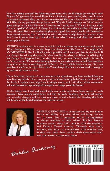 You live asking yourself the following questions: why do all things go wrong for me? Why can't I get ahead at work? If you have a business, you wonder, why can't I have a successful business? Why can't I have true friends? Why can't I have a stable relationship? Why do my partners always leave me? Why do I self-sabotage so I don't receive good things in my life? Why can't I live the life I really want? Why do I al-ways think I'm not capable? Or why do I always live in fear that something terrible will happen? They all sound like a tremendous nightmare, right? But many people ask themselves these questions every day. I decided to write this book to help those in the same situation I was in some time ago, who don't know what's wrong with them and need to wake up just like me. AWAKEN or despertar, is a book in which I tell you about my experience and what I did to change my life; it can also help you change your life forever. You might think it's IMPOSSIBLE! But I will tell you it is possible and I will show you how in this book. If you always live reliving the past, for what you did, for what you didn't do, reliving the bad things that happened to you, there is a way to erase those thoughts forever. It can't be, you say. We live with limiting beliefs in our subconscious mind that resurface every time we have something good before us. Those beliefs lead us to say, "it is not possible, it can't be, it is just fairy tales," and things like that, so what we do, then give up and not do what we want. Up to this point, because of your answers to the questions, you have realized that you have limiting beliefs. How can you get rid of those limiting beliefs once and for all? In this book, I explain what helped me in simple terms. I will share all the conventional and alternative psychological therapies to change your life forever. All the things that I did and shared with you in this book have been proven to work because I have already tried them, and they do work. Reading this book will inspire you to make changes and do what you must to lead a better life. Reading this book will be one of the best decisions you will ever make.