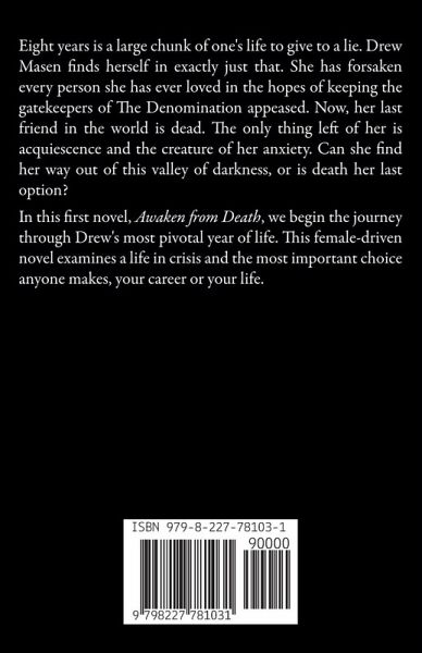 Eight years is a large chunk of one's life to give to a lie. Drew Masen finds herself in exactly just that. She has forsaken every person she has ever loved in the hopes of keeping the gatekeepers of The Denomination appeased. Now, her last friend in the world is dead. The only thing left of her is acquiescence and the creature of her anxiety. Can she find her way out of this valley of darkness, or is death her last option? In this first novel, Awaken from Death by Spring Cora, we begin the journey through Drew Masens most pivotal year of life. A 270-page female-driven novel examines a life in crisis and what is most important.