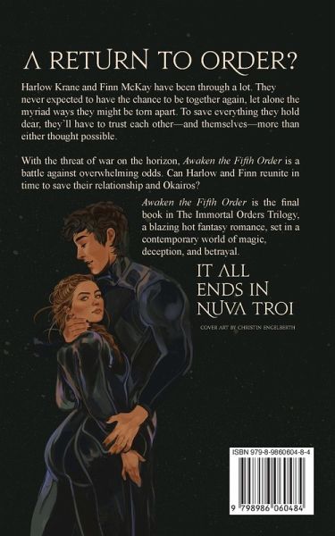It all ends in Nuva Troi. Harlow Krane and Finn McKay have been through a lot. They never expected to have the chance to be together again, let alone the myriad ways they might be torn apart. To save everything they hold dear, they'll have to trust each other-and themselves-more than either thought possible. With the threat of war on the horizon, Awaken the Fifth Order is a race against time and overwhelming odds. Can Harlow and Finn reunite to save their relationship, and all they hold dear? Awaken the Fifth Order is the final book in The Immortal Orders Trilogy, a blazing hot fantasy romance, set in a contemporary world of magic, deception, and betrayal.
