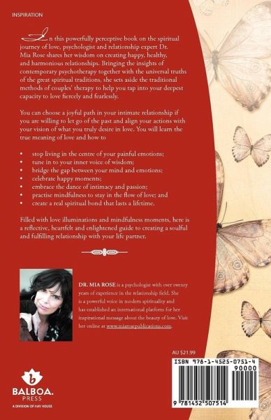 In this powerfully perceptive book on the spiritual journey of love, psychologist and relationship expert Dr. Mia Rose shares her wisdom on creating happy, healthy, and harmonious relationships. Bringing the insights of contemporary psychotherapy together with the universal truths of the great spiritual traditions, she sets aside the traditional methods of couples’ therapy to help you tap into your deepest capacity to love fiercely and fearlessly. You can choose a joyful path in your intimate relationship if you are willing to let go of the past and align your actions with your vision of what you truly desire in love. You will learn the true meaning of love and how to • stop living in the centre of your painful emotions; • tune in to your inner voice of wisdom; • bridge the gap between your mind and emotions; • celebrate happy moments; • embrace the dance of intimacy and passion; • practise mindfulness to stay in the flow of love; and • create a real spiritual bond that lasts a lifetime. Filled with love illuminations and mindfulness moments, here is a reflective, heartfelt and enlightened guide to creating a soulful and fulfilling relationship with your life partner.