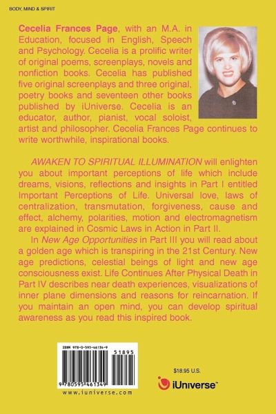 AWAKEN TO SPIRITUAL ILLUMINATION will enlighten you about important perceptions of life which include dreams, visions, reflections and insights in Part I entitled Important Perceptions of Life. Universal love, laws of centralization, transmutation, forgiveness, cause and effect, alchemy, polarities, motion and electromagnetism are explained in Cosmic Laws in Action in Part II. In New Age Opportunities in Part III you will read about a golden age which is transpiring in the 21st Century. New age predictions, celestial beings of light and new age consciousness exist. Life Continues After Physical Death in Part IV describes near death experiences, visualizations of inner plane dimensions and reasons for reincarnation. If you maintain an open mind, you can develop spiritual awareness as you read this inspired book.