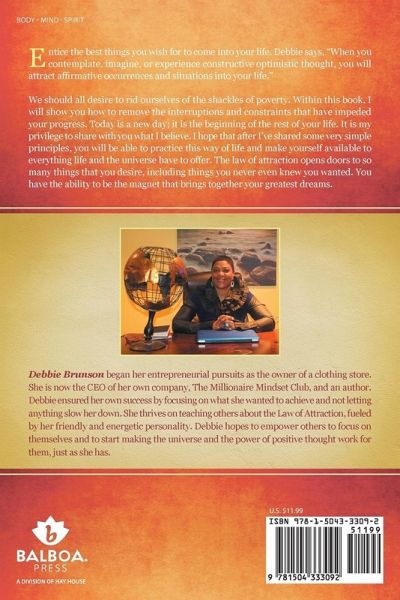 Entice the best things you wish for to come into your life. Debbie says, "When you contemplate, imagine, or experience constructive optimistic thought, you will attract affirmative occurrences and situations into your life." We should all desire to rid ourselves of the shackles of poverty. Within this book, I will show you how to remove the interruptions and constraints that have impeded your progress. Today is a new day; it is the beginning of the rest of your life. It is my privilege to share with you what I believe. I hope that after I've shared some very simple principles, you will be able to practice this way of life and make yourself available to everything life and the universe have to offer. The law of attraction opens doors to so many things that you desire, including things you never even knew you wanted. You have the ability to be the magnet that brings together your greatest dreams.