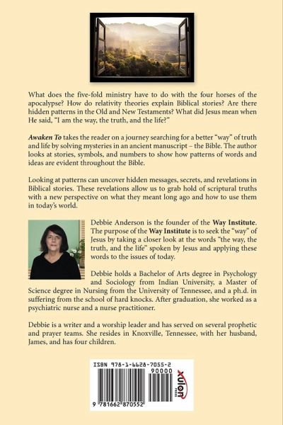 What does the five-fold ministry have to do with the four horses of the apocalypse? How do relativity theories explain Biblical stories? Are there hidden patterns in the Old and New Testaments? What did Jesus mean when He said, "I am the way, the truth, and the life?" Awaken To takes the reader on a journey searching for a better "way" of truth and life by solving mysteries in an ancient manuscript - the Bible. The author looks at stories, symbols, and numbers to show how patterns of words and ideas are evident throughout the Bible. Looking at patterns can uncover hidden messages, secrets, and revelations in Biblical stories. These revelations allow us to grab hold of scriptural truths with a new perspective on what they meant long ago and how to use them in today's world. Debbie Anderson is the founder of the Way Institute. The purpose of the Way Institute is to seek the "way" of Jesus by taking a closer look at the words "the way, the truth, and the life" spoken by Jesus and applying these words to the issues of today. Debbie holds a Bachelor of Arts degree in Psychology and Sociology from Indian University, a Master of Science degree in Nursing from the University of Tennessee, and a ph.d. in suffering from the school of hard knocks. After graduation, she worked as a psychiatric nurse and a nurse practitioner. Debbie is a writer and a worship leader and has served on several prophetic and prayer teams. She resides in Knoxville, Tennessee, with her husband, James, and has four children.
