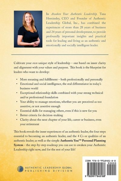 In Awaken Your Authentic Leadership, Tana Heminsley, CEO and Founder of Authentic Leadership Global, Inc., has combined the experiences of more than 28 years of business and 24 years of personal development, to provide profoundly important insights and practical tools for leading and living as an authentic and emotionally and socially intelligent leader. ----------- Cultivate your own unique style of leadership - one based on inner clarity and alignment with your values and purpose. This book is the blueprint for leaders who want to develop: More meaning and fulfillment - both professionally and personally Emotional and social intelligence, the real differentiator in today's business world Execptional relationship skills combined with your strong technical and/or professional foundation Your ability to manage emotions, whether you are preceived as too assertive, or not assertive enough Essential skills for managing others, even if this is new for you Better criteria for decision-making Clarity about the next chapter of your life, career or business, even your retirement This book reveals the inner experiences of an authentic leader, the four steps essential to becoming an authentic leader, and the 4 Cs or qualities of an authentic leader; as well as the simple Authentic You(TM) Personal Planning System - the step-by-step roadmap you can use to awaken your Authentic Leadership right now, and for the rest of your life!
