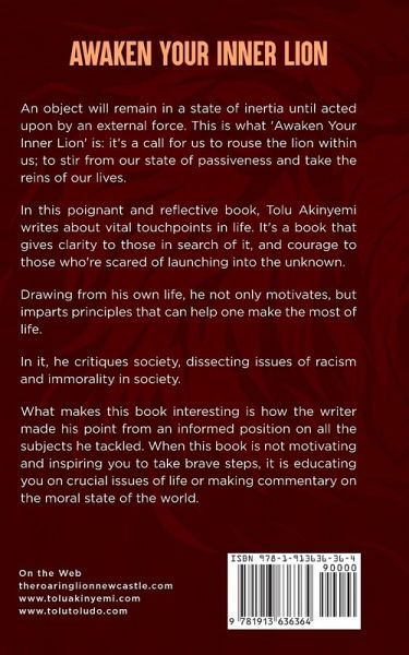 An object will remain in a state of inertia until acted upon by an external force. This is what 'Awaken Your Inner Lion' is: it's a call for us to rouse the lion within us; to stir from our state of passiveness and take the reins of our lives. In this poignant and reflective book, Tolu Akinyemi writes about vital touchpoints in life. It's a book that gives clarity to those in search of it, and courage to those who're scared of launching into the unknown. Drawing from his own life, he not only motivates, but imparts principles that can help one make the most of life. In it, he critiques society, dissecting issues of racism and immorality in society. What makes this book interesting is how the writer made his point from an informed position on all the subjects he tackled. When this book is not motivating and inspiring you to take brave steps, it is educating you on crucial issues of life or making commentary on the moral state of the world. The author's writing style makes this book enjoyable. Each essay begins with a quote that the chapter is anchored on-words that one can reflect upon long after reading the book. In 'Awaken Your Inner Lion', Tolu Akinyemi has given the world an offering that comes from his soul; and so it has the power to impact and stir one to action.