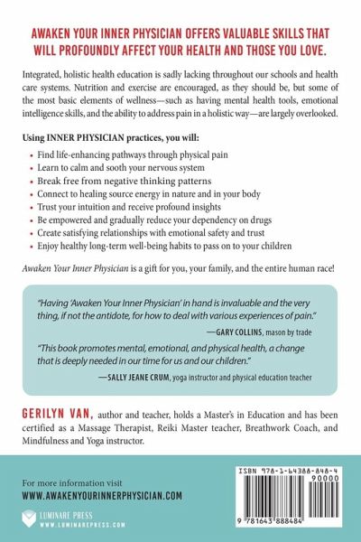 This book will profoundly affect your health, mentally, emotionally and physically. Learn valuable skills that our Schools and Health Care systems do not teach us (and should!). Learn how to ... *Calm anxiety and soothe your nervous system *Be with your mental activity and see what is true *Release negative thinking *Shift depression lovingly *Address physical pain holistically *Reduce addictions, dependency on the Health Care system and drugs *Connect to healing energy in your body and in nature *Create satisfying relationships with emotional safety and trust *Strengthen connection to your authentic Self You can't help but be positively altered after reading this book! In our schools and Health Care systems, nutrition and exercise are encouraged, as they should be, but some of the basic elements of wellness - mental health, emotional intelligence and how to deal with physical pain - are largely overlooked. The lack of these skills shows up in us, our families and society in dysfunctional ways; creating unhealthy habits, addictions, trauma and even violence. Hopefully, someday, Awaken Your INNER PHYSICIAN will be part of the Health Care curriculum, for ALL of us.