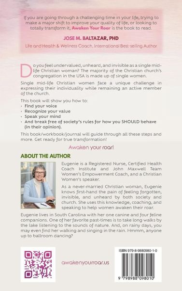 Do you feel undervalued, unheard, and invisible as a single mid-life Christian woman? The majority of the Christian church's congregation in the USA is made up of single women. Single mid-life Christian women face a unique challenge in expressing their individuality while remaining an active member of the church. This book will show you how to:Find your voice Recognize your value Speak your mind And break free of society's rules for how you SHOULD behave (in their opinion). This book/workbook/journal will guide through all these steps and more. Get ready for true transformation! Awaken your roar!
