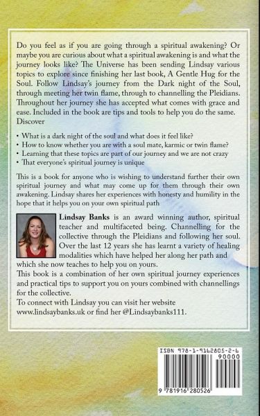 Are you going through a spiritual awakening? Or maybe you are curious about what a spiritual awakening is and what the journey looks like? The Universe has been sending Lindsay various topics to explore since finishing her last book, A Gentle Hug for the Soul. Follow Lindsay's journey from going through her Dark Night of the Soul, through meeting her twin flame, through to channelling the Pleidians. Throughout her journey she has accepted what comes with ease and grace. Included in the book are tips and tools to help you do the same. Discover What is a Dark Night of the Soul and what does it feel like? How to know whether you are with a soul mate, a karmic or a twin flame Learning that these topics are part of our journey and we are not crazy. Lindsay shares her experience with honesty and humility in the hope that it helps you on your own spiritual path.