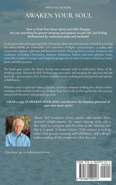 Are you searching for greater meaning and purpose in your life, but feeling disillusioned by traditional paths and methods? Look no further than Awaken Your Soul. A Journey to Inner Spirit and Life's Purpose by author and spiritual seeker Theodore Orenstein. In this powerful and inspiring book, Orenstein shares his own journey toward discovering the indescribable yet undeniably real experience of higher consciousness - a reality that transcends religious, spiritual, and humanist beliefs. Drawing from a variety of sources and traditions, including Christianity, Judaism, Hinduism, Taoism, and even atheism, Orenstein offers readers a unique and insightful perspective on what it means to find one's inner spirit and life's purpose. The book goes across the board, diving into concepts such as meditation, limits of the thinking mind, Heaven & Hell, how to find your own path, and merging the spiritual and the material... Just to name a few. A must-read for anyone seeking personal growth and spiritual fulfillment. Whether you're a spiritual seeker, a skeptic, or simply someone looking for a deeper understanding of the world around you, Awaken Your Soul is the perfect guide for your journey toward self-discovery and personal growth. So why wait? GRAB a copy Awaken Your Soul today and discover the limitless potential of your own inner spirit!
