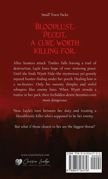 Bloodlust. Deceit. A cure worth killing for. After hunters attack Timber Falls leaving a trail of destruction, Layla loses hope of ever restoring peace. Until she finds Wyatt Hale-the mysterious yet gravely injured hunter-hiding under her porch. Healing him is a no-brainer. Only, his swoony dimples and sinful whispers blur enemy lines. When Wyatt reveals a traitor in her pack, their forbidden desire becomes even more dangerous. Now, Layla's torn between her duty and trusting a bloodthirsty killer who's supposed to be her enemy. But what if those closest to her are the biggest threat?