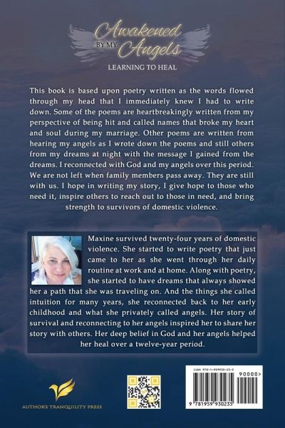 This book is based upon poetry written as the words flowed through my head that I immediately knew I had to write down. Some of the poems are heartbreakingly written from my perspective of being hit and called names that broke my heart and soul during my marriage. Other poems are written from hearing my angels as I wrote down the poems and still others from my dreams at night with the message I gained from the dreams. I reconnected with God and my angels over this period. We are not left when family members pass away. They are still with us. I hope in writing my story, I give hope to those who need it, inspire others to reach out to those in need, and bring strength to survivors of domestic violence.