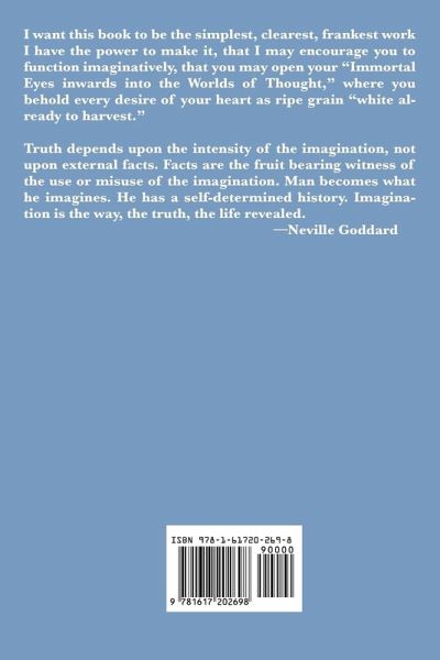 I want this book to be the simplest, clearest, frankest work I have the power to make it, that I may encourage you to function imaginatively, that you may open your "Immortal Eyes inwards into the Worlds of Thought," where you behold every desire of your heart as ripe grain "white already to harvest." Truth depends upon the intensity of the imagination, not upon external facts. Facts are the fruit bearing witness of the use or misuse of the imagination. Man becomes what he imagines. He has a self-determined history. Imagination is the way, the truth, the life revealed. -Neville Goddard Wilder Publications is a green publisher. All of our books are printed to order. This reduces waste and helps us keep prices low while greatly reducing our impact on the environment.