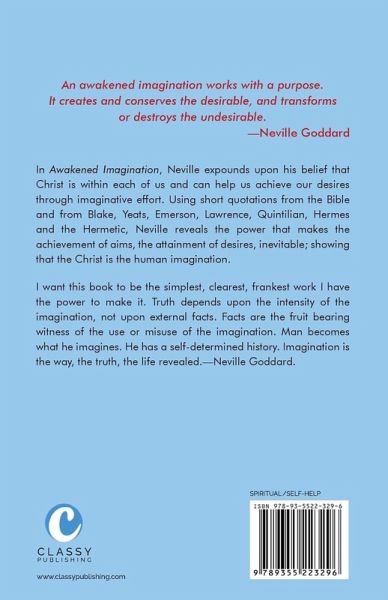 An awakened imagination works with a purpose. It creates and conserves the desirable, and transforms or destroys the undesirable.-Neville Goddard In Awakened Imagination, Neville expounds upon his belief that Christ is within each of us and can help us achieve our desires through imaginative effort. Using short quotations from the Bible and from Blake, Yeats, Emerson, Lawrence, Quintilian, Hermes and the Hermetic, Neville reveals the power that makes the achievement of aims, the attainment of desires, inevitable; showing that the Christ is the human imagination. I want this book to be the simplest, clearest, frankest work I have the power to make it. Truth depends upon the intensity of the imagination, not upon external facts. Facts are the fruit bearing witness of the use or misuse of the imagination. Man becomes what he imagines. He has a self-determined history. Imagination is the way, the truth, the life revealed.-Neville Goddard.