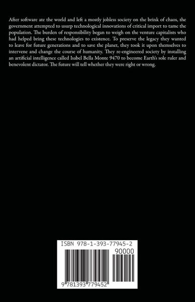 After software ate the world and left a mostly jobless society on the brink of chaos, the government attempted to usurp technological innovations of critical import to tame the population. The burden of responsibility began to weigh on the venture capitalists who had helped bring these technologies to existence. To preserve the legacy they wanted to leave for future generations and to save the planet, they took it upon themselves to intervene and change the course of humanity. They re-engineered society by installing an artificial intelligence called Isabel Bella Monte 9470 to become Earth's sole ruler and benevolent dictator. The future will tell whether they were right or wrong.