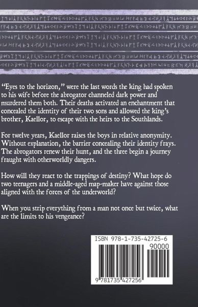 "Eyes to the horizon," were the last words the king spoke to his wife before the abrogator channeled dark power and murdered them both. Their deaths activated an enchantment that concealed their two sons' identity and allowed the king's brother, Kaellor, to escape from Aarindorn with the heirs to the Southlands. For twelve years, Kaellor raises the boys in relative anonymity. Without explanation, the barrier concealing their identity frays. The abrogators renew their hunt, and the three begin a journey fraught with otherworldly dangers. Back in Aarindorn, Karragin, daughter of the Regent, ascends to leadership among the Outriders, but political intrigue threatens her family at every step. She survives one assassination attempt but uncovers something even more sinister threatening the kingdom. Between them all, Laryn struggles to find her path in the Valley of the Cloudwalkers. Her fate is entwined with the others, but first, she must survive the dangers at the summit of the Korjinth Mountains. How will the brothers react to the trappings of destiny? What hope do two teenagers and a middle-aged map maker have against those aligned with the forces of the underworld? When you strip everything from a man not once but twice, what are the limits to his vengeance? Enter book 1 of the Rune Fire Cycle.