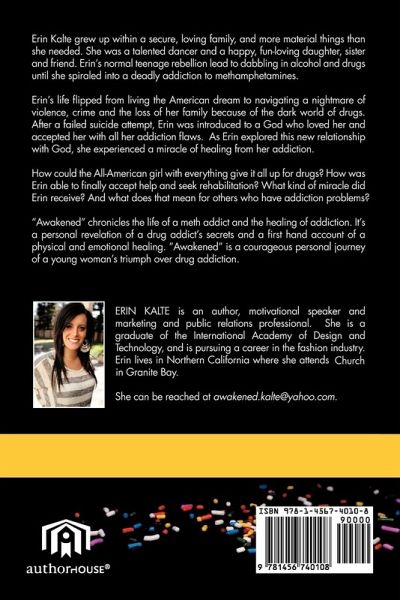 Erin Kalte grew up within a secure, loving family, and more material things than she needed. She was a talented dancer and a happy, fun-loving daughter, sister and friend. Erin's normal teenage rebellion lead to dabbling in alcohol and drugs until she spiraled into a deadly addiction to methamphetamines. Erin's life flipped from living the American dream to navigating a nightmare of violence, crime and the loss of her family because of the dark world of drugs. After a failed suicide attempt, Erin was introduced to a God who loved her and accepted her with all her addiction flaws. As Erin explored this new relationship with God, she experienced a miracle of healing from her addiction. How could the All-American girl with everything give it all up for drugs? How was Erin able to finally accept help and seek rehabilitation? What kind of miracle did Erin receive? And what does that mean for others who have addiction problems? "Awakened" chronicles the life of a meth addict and the healing of addiction. It's a personal revelation of a drug addict's secrets and a first hand account of a physical and emotional healing. "Awakened" is a courageous personal journey of a young woman's triumph over drug addiction.