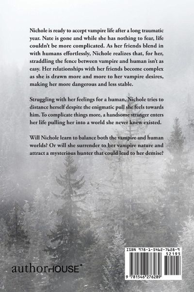 Nichole is ready to accept vampire life after a long traumatic year. Nate is gone and while she has nothing to fear, life couldn't be more complicated. As her friends blend in with humans effortlessly, Nichole realizes that, for her, straddling the fence between vampire and human isn't as easy. Her relationships with her friends become complex as she is drawn more and more to her vampire desires, making her more dangerous and less stable. Struggling with her feelings for a human, Nichole tries to distance herself despite the enigmatic pull she feels towards him. To complicate things more, a handsome stranger enters her life pulling her into a world she never knew existed. Will Nichole learn to balance both the vampire and human worlds? Or will she surrender to her vampire nature and attract a mysterious hunter that could lead to her demise?