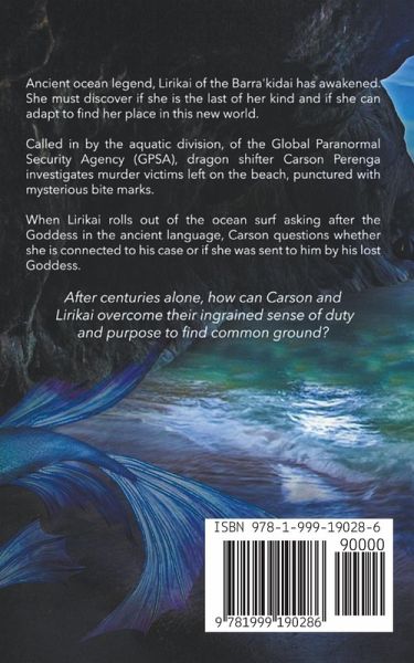 Ancient ocean legend, Lirikai of the Barra'kidai has awakened. She must discover if she is the last of her kind and if she can adapt to find her place in this new world. Called in by the aquatic division, of the Global Paranormal Security Agency (GPSA), dragon shifter Carson Perenga investigates murder victims left on the beach, punctured with mysterious bite marks. When Lirikai rolls out of the ocean surf asking after the Goddess in the ancient language, Carson questions whether she is connected to his case or if she was sent to him by his lost Goddess. After centuries alone, how can Carson and Lirikai overcome their ingrained sense of duty and purpose to find common ground, when one is dedicated to the law and the other only understands vengeance?