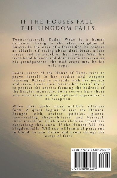 Twenty-year-old Raden Wade is a human carpenter living in the elven kingdom of Enicia. In the wake of a forest fire, he rescues an elderly elf raving about dead birds, a lost sister, and an attack on her House. With his livelihood burned and destitution threatening his grandparents, the mad crone may be his only hope. Leoni, sister of the House of Time, tries to prove herself in her studies and weapons' training. Raised in solitude with her mentor and raven, Leoni must master her arts if she is to protect the secrets forming the bedrock of the Enician monarchy. Some secrets hurt those who serve them, and an orphaned apprentice is no exception. When their paths cross, unlikely alliances form. A quest begins to save the Houses. Fraught with ancient politics, giants, face-stealing shape-shifters, and betrayal, their search for truth leads them to reevaluate everything they know. If the Houses fall, the kingdom falls. Will two millennia of peace end in blood, or can Raden and Leoni change the wings of fate?